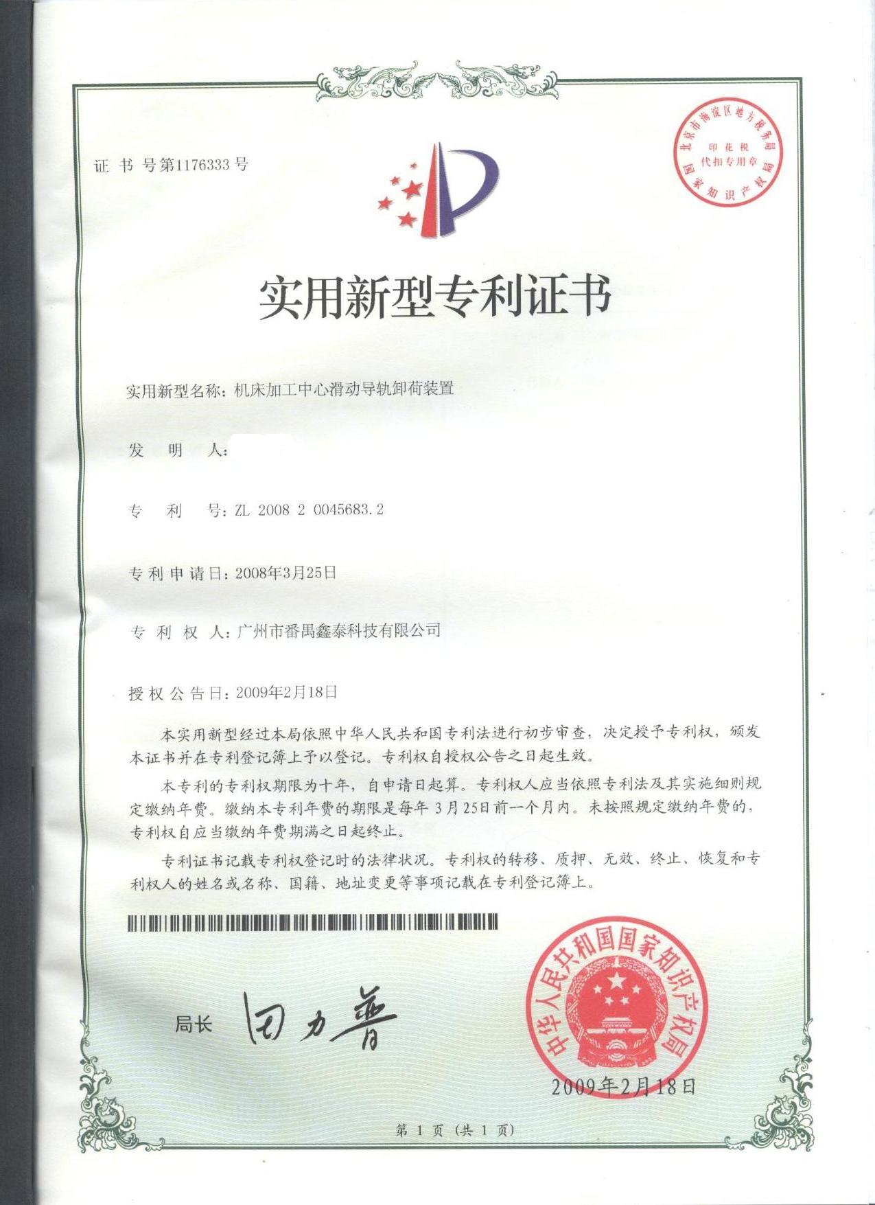 經過公司技術部門員工的辛勤努力,鑫泰集團獲得“機床加工中心滑動導軌卸荷裝置”的實用新型專利